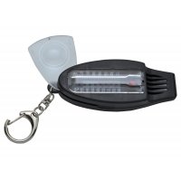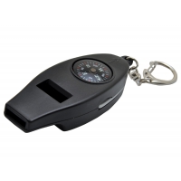 Pfeife aus schwarzem Kunststoff, 4 Funktionen: Pfeife, Lupe, Kompass, Thermometer. Mit Schlüsselring.
