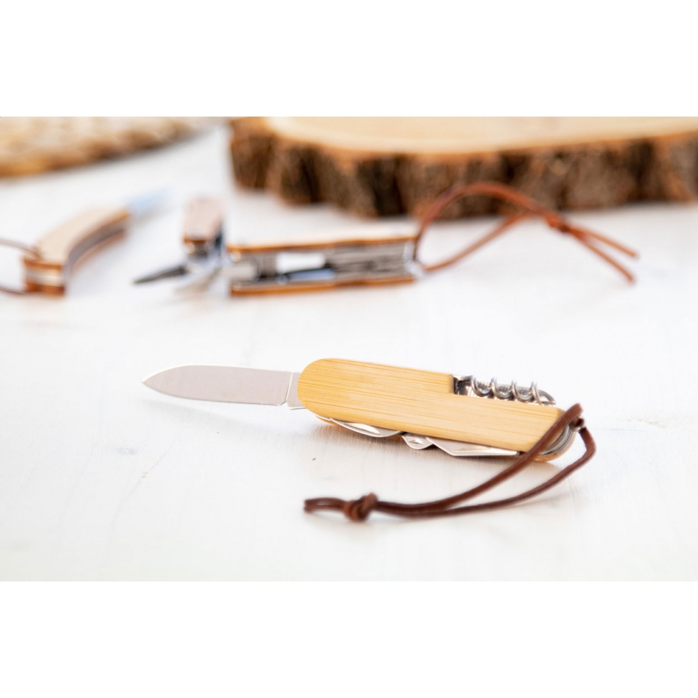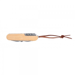 Artikel-Nr: AND721902Taschenmesser aus Edelstahl mit Bambusgriff und 9 Funktionen. Mit Band aus Kunstleder.