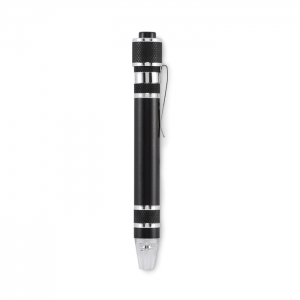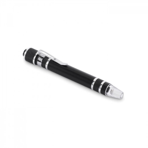Artikel-Nr: OCBMO2498-03Multitool in Form eines Stiftes aus recyceltem Aluminium. Inkl. 3 Schlitz- und 3 Phillips-Schraubendreherköpfen und Taschenlampe. Inkl. 4 Knopfzellen LR41.