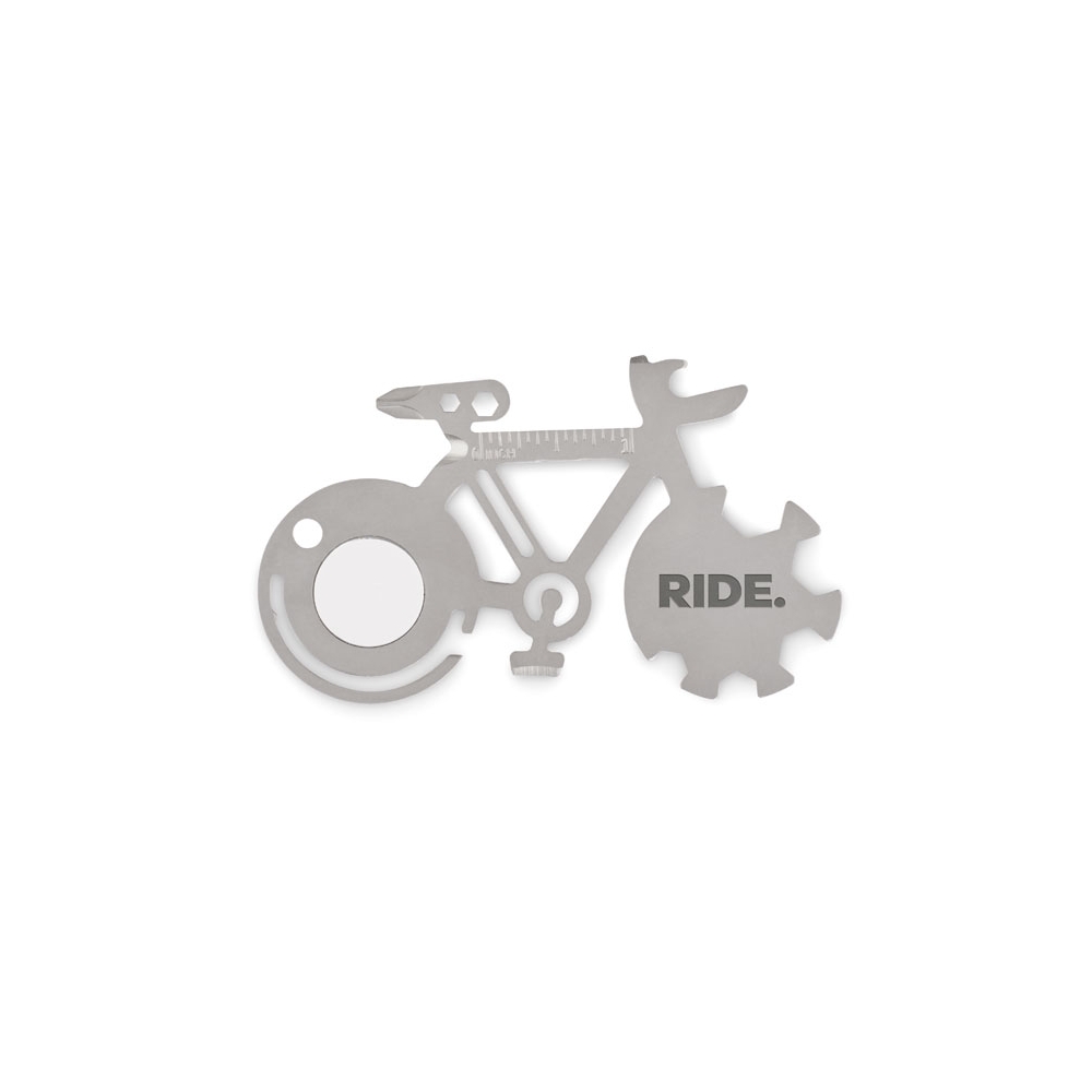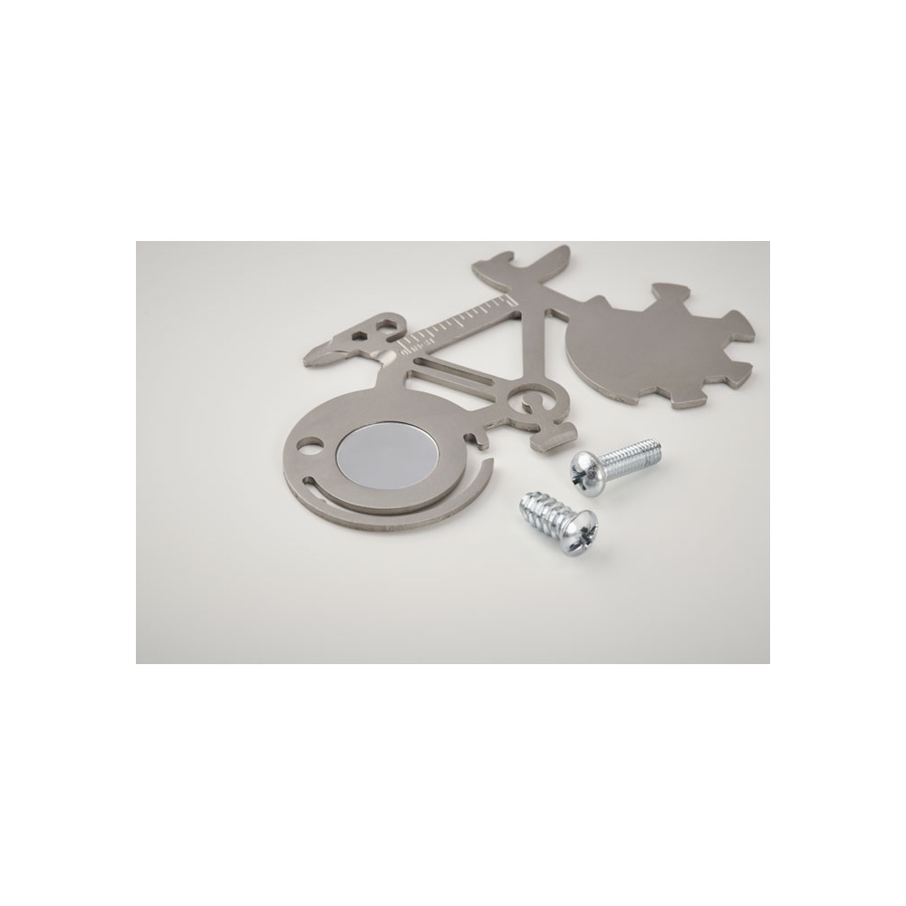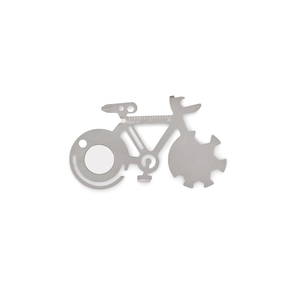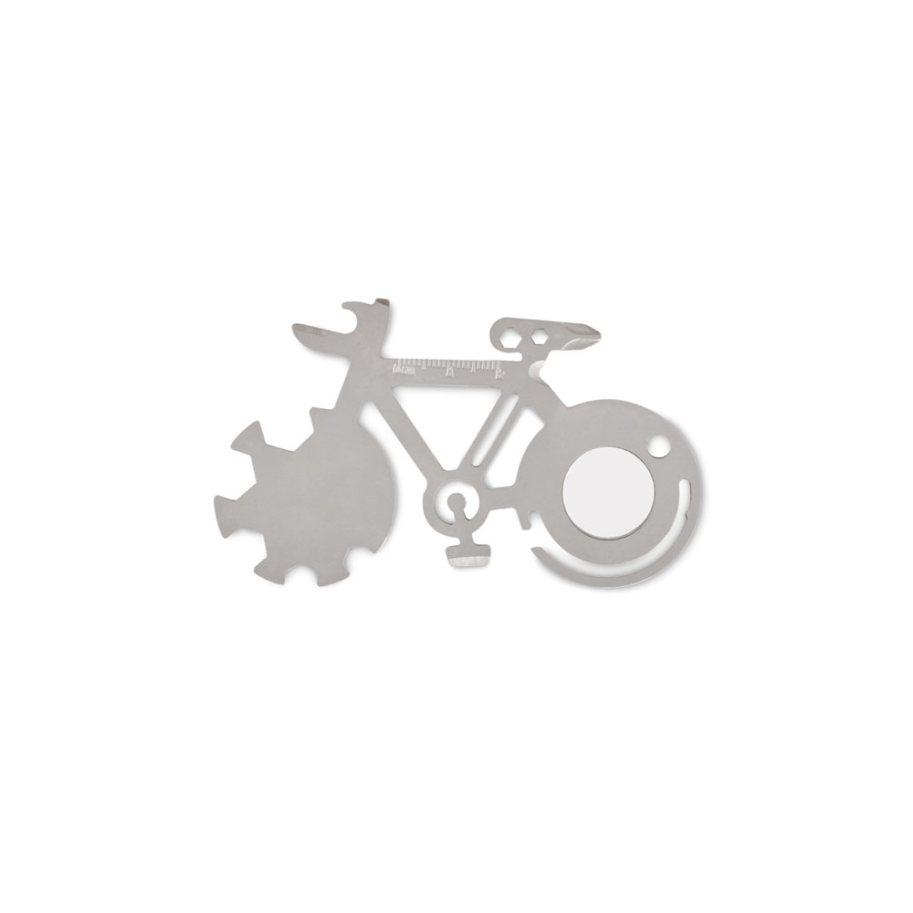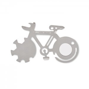 Artikel-Nr: OCBMO6701-16Multifunktionswerkzeug aus Edelstahl mit 11 Funktionen in Optik eines Fahrrades. Bietet u. a. folgende Funktionen: Kapselheber, Messer, Lineal und Kreuzschlitzschraubendreher.