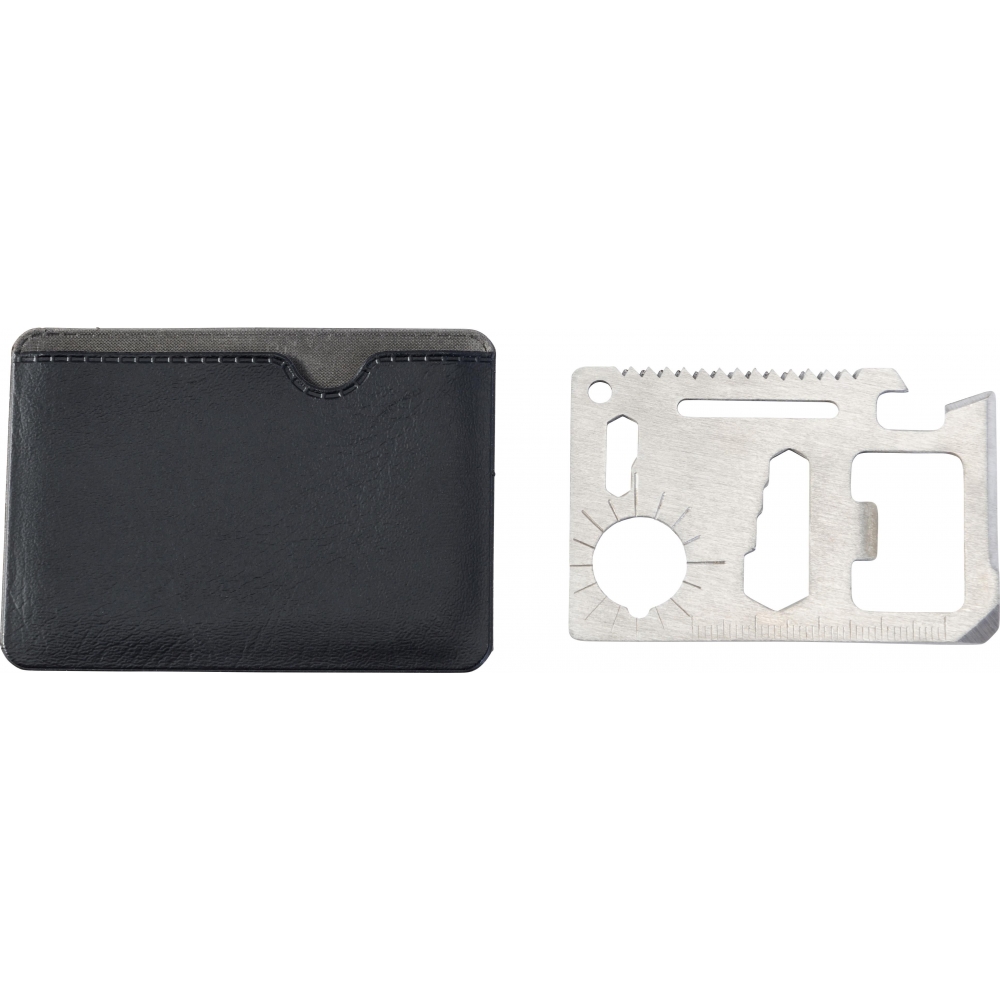 Artikel-Nr: GIV8956001Multifunktionswerkzeug aus Edelstahl mit 11 Funktionen: Messer, Dosenöffner, Flügelmutter-Schraubendreher, Säge, Schraubendreher, Flaschenöffner, Lineal, verschieden große Schraubenschlüssel in einem PU Beutel.