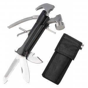 Artikel-Nr: EAG085003Multifunktionswerkzeug (Edelstahl) bestehend aus einem Hammer, einer Feile, zwei Klingen, einer Säge, einem Schlitzschraubendreher und einem Flaschenöffner. Im Lieferumfang enthalten ist ein passendes Etui, auf dem wir mittig Ihre Werbung drucken.