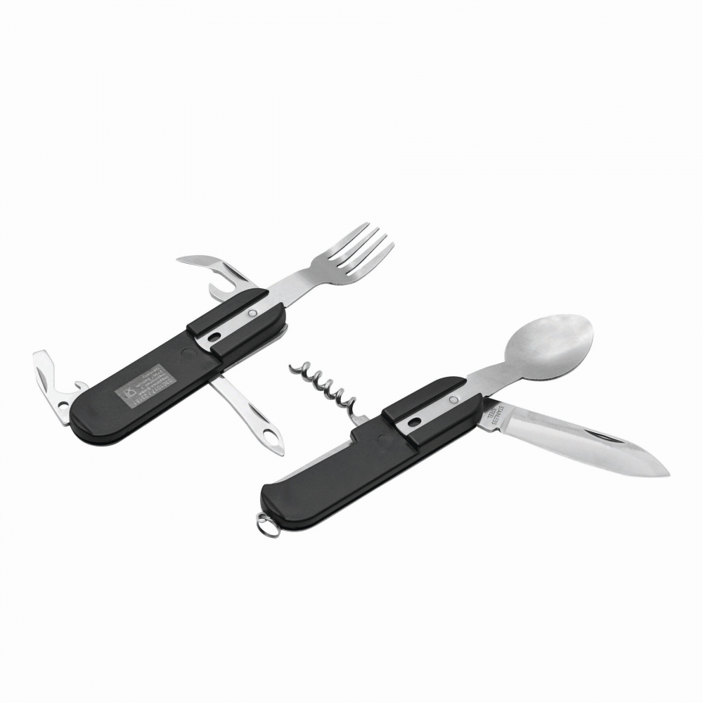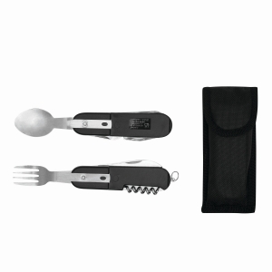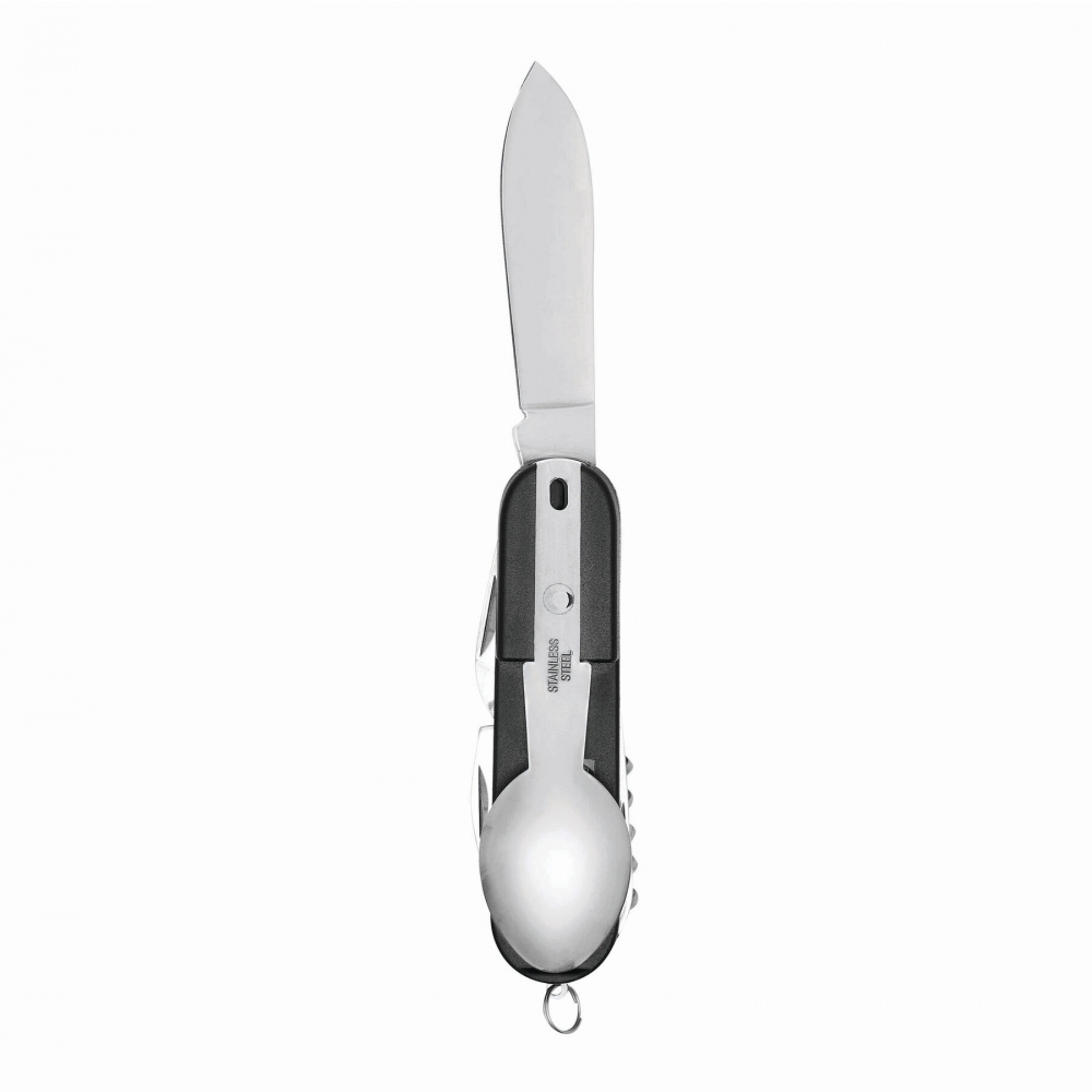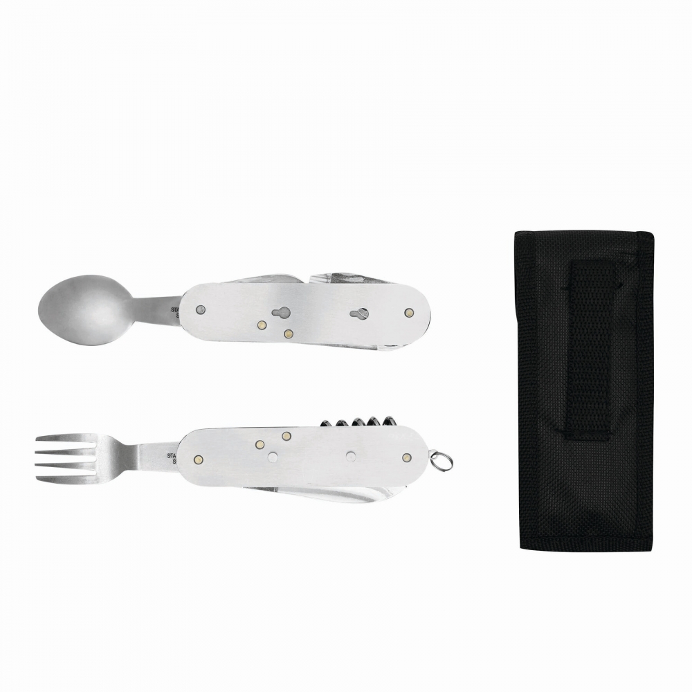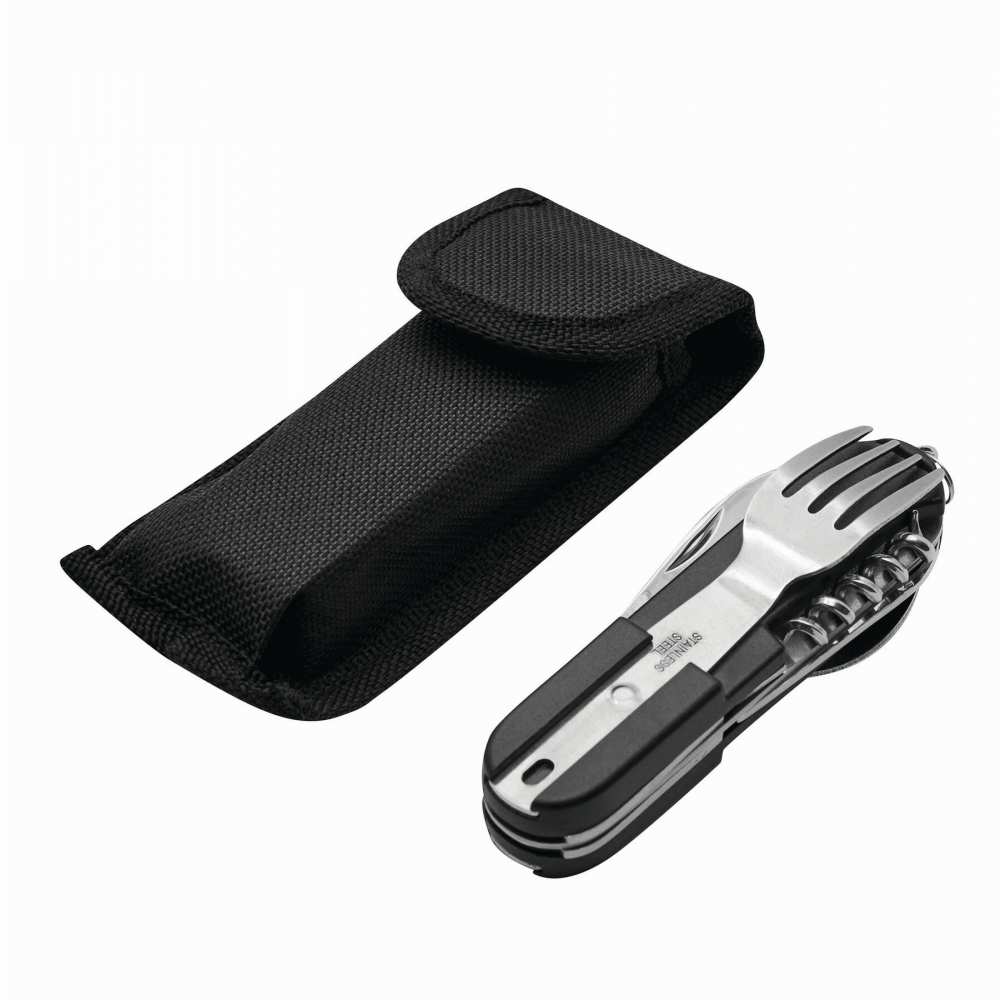 Artikel-Nr: INP56-0301017Edelstahl-Multifunktionswerkzeug WILDLIFE: mit ausklappbarem Messer, Flaschen- und Dosenöffner, Entschupper und Korkenzieher, ausziehbarer Gabel und Löffel, mit Schlüsselring, in Tasche mit integrierter Gürtelschlaufe und Klettverschluss – ideal für Camping, Picknick und Outdooraktivitäten