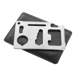 Artikel-Nr: AND809547-21Multitool in Kreditkartenform aus Edelstahl, mit 11 Funktionen, in Kunstlederhülle.