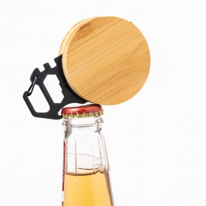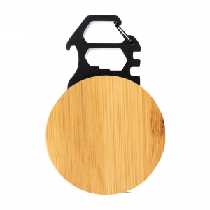 Artikel-Nr: AND733588Multitool aus Bambus und schwarzem Edelstahl mit einem 1m Maßband, Flaschenöffner, 5 Sechskantschraubenschlüsseln und Karabinerhaken.