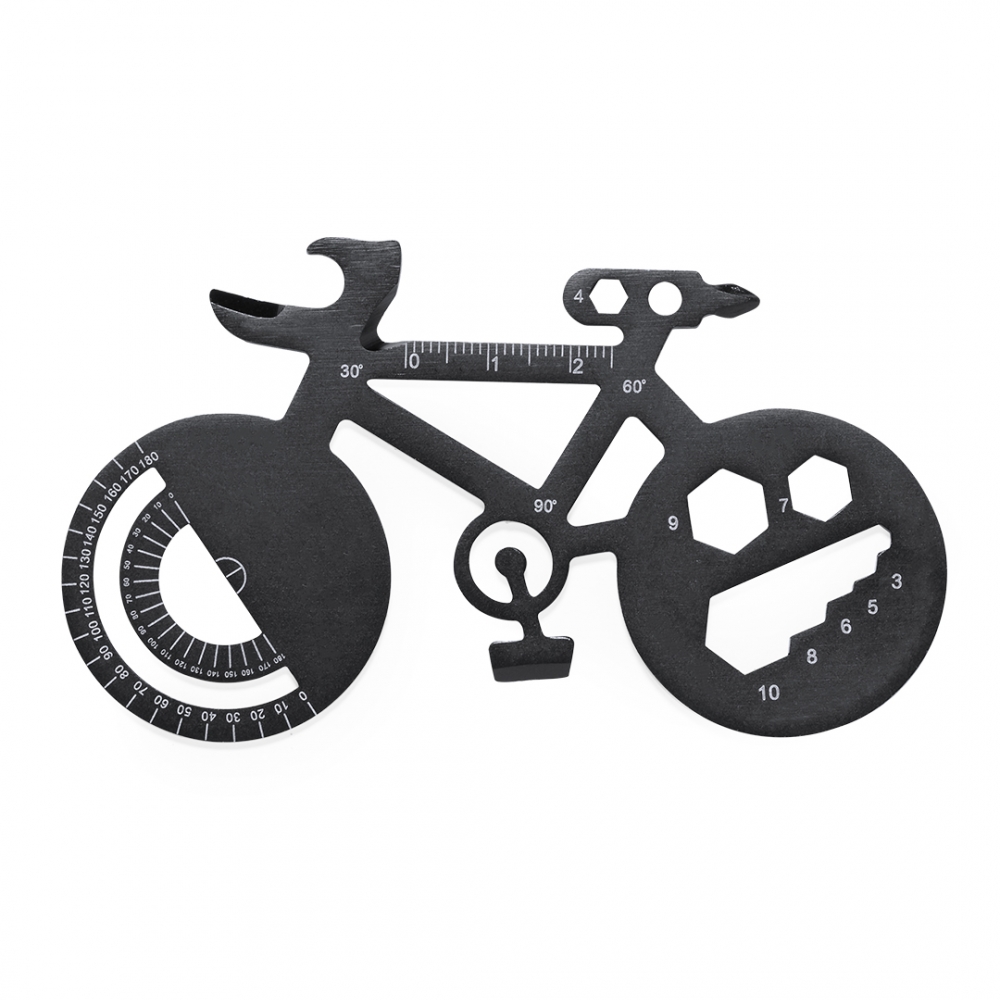 Artikel-Nr: KTO20995002000Handliches und nützliches Multifunktionswerkzeug aus Edelstahl in Fahrradform. Mit 16 Funktionen, unter anderem: Schlitz- und Kreuzschlitzschraubendreher, Schraubenschlüssel für Sechskantmuttern in verschiedenen Größen, Lineal, Winkelmesser und Flaschenöffner. Präsentiert in einer recycelten Papiertüte.