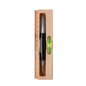 Artikel-Nr: KTO20477000000Praktisches Multitool mit 5 Funktionen, aus widerstandsfähigem Carbonstahl und in schwarzer Ausführung. Mit Schraubendreherfunktionen (Flach- und Kreuzschlitz) und Kugelschreiber mit blauer Tinte (Jumbo-Patrone). Präsentiert in einem robusten Bambusetui mit integrierter Wasserwaage und Lineal. Einzeln verpackt in einer Design-Kraftbox.
