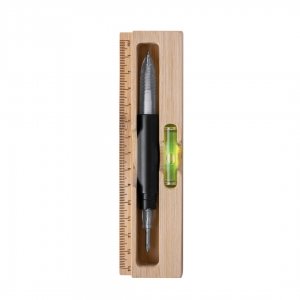 Artikel-Nr: KTO20477000000Praktisches Multitool mit 5 Funktionen, aus widerstandsfähigem Carbonstahl und in schwarzer Ausführung. Mit Schraubendreherfunktionen (Flach- und Kreuzschlitz) und Kugelschreiber mit blauer Tinte (Jumbo-Patrone). Präsentiert in einem robusten Bambusetui mit integrierter Wasserwaage und Lineal. Einzeln verpackt in einer Design-Kraftbox.