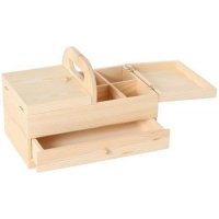 Aus Holz, mit Tragegriff, geräumigen Fächern und Schublade.