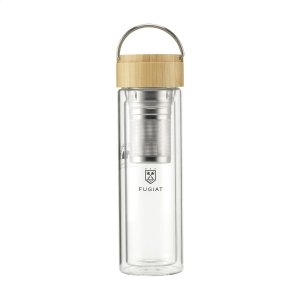 Artikel-Nr: CLP261458-823Doppelwandige Flasche aus hochwertigem, transparentem Borosilikatglas. Enthält ein Edelstahl-Ei mit Teefilter für losen Tee, der dem Wasser Geschmack verleiht. Mit Bambus-Schraubverschluss und Edelstahl-Tragegriff. 100% auslaufsicher. Nicht spülmaschinengeeignet. Fassungsvermögen 300 ml.