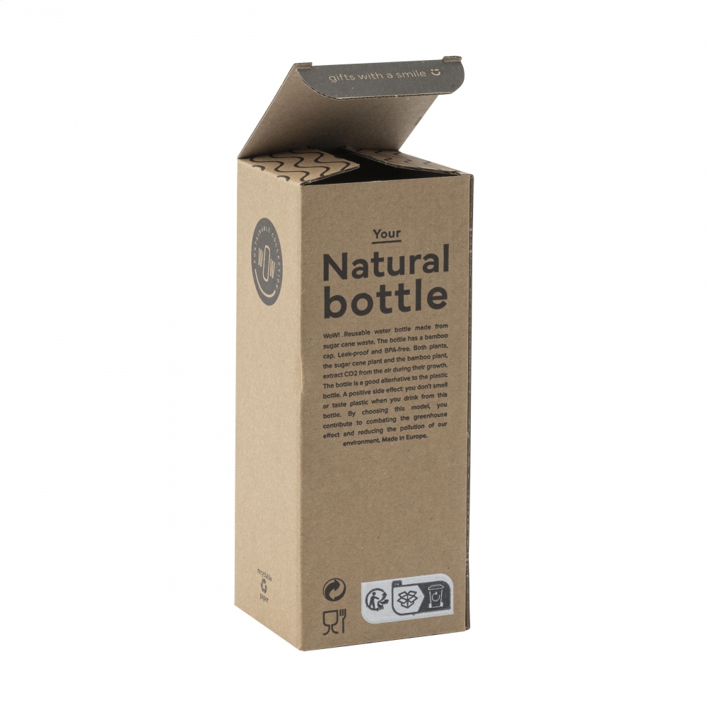 Artikel-Nr: CLPW05110WoW! Wiederverwendbare Wasserflasche aus Zuckerrohrabfällen. Die Flasche hat einen Bambusverschluss. Auslaufsicher. Nicht spülmaschinengeeignet. Beide Pflanzen, die Zuckerrohrpflanze und die Bambuspflanze, entziehen der Luft während ihres Wachstums CO2. Die Flasche ist eine gute Alternative zur Plastikflasche. Fassungsvermögen 500 ml. Hergestellt in Europa. Wird einzeln in einem Kraftkarton geliefert.