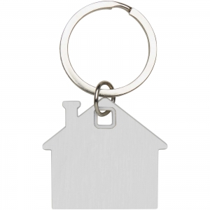 Artikel-Nr: CPO10459501Schlüsselanhänger in Form eines Hauses mit einer Edelstahlplatte mit mattem Design auf der Vorder- und Rückseite und einem farbigen Kunststoffchip in der Mitte.