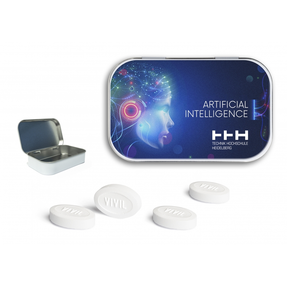 Artikel-Nr: MGN09004-0028Scharnierdeckeldose aus Weißblech in Weiß oder Blank, gefüllt mit Bonbons oder zuckerfreien Vivil Friendship Pfefferminzpastillen.