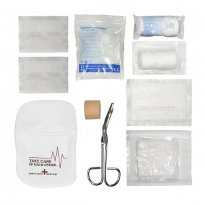 Artikel-Nr: ELT01881001-00000Das praktische Set ist immer zur Hand. Polyester-Tasche befüllt mit Qualitäts-Artikeln: Heftpflaster, Wundschnellverband, Pflasterstrips, Verbandpäckchen, Kompressen, Fixierbinde, Schere und Einmalhandschuhen.