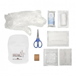 Artikel-Nr: ELT01880001-00000Das praktische Set ist immer zur Hand. Polyester-Tasche befüllt mit Qualitäts-Artikeln: Heftpflaster, Wundschnellverband, 2 Pflasterstrips, Verbandpäckchen, 2 Kompressen, Fixierbinde, kleiner Schere und Einmalhandschuhen.
