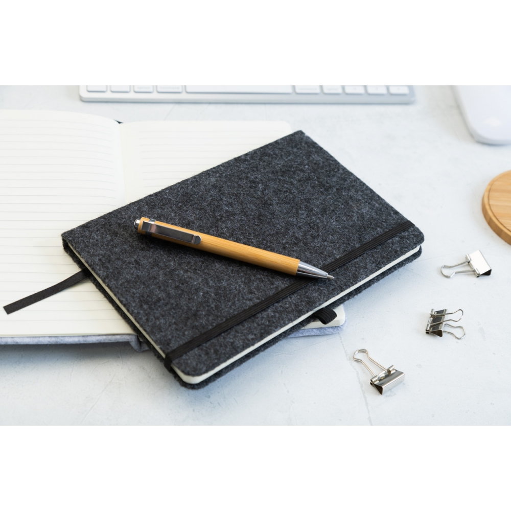 Artikel-Nr: AND808171-80Notizbuch im A5-Format mit RPET-Filzumschlag und 80 linierten Seiten aus recyceltem Papier. Mit Lesezeichen, Gummiband und Stifthalter.