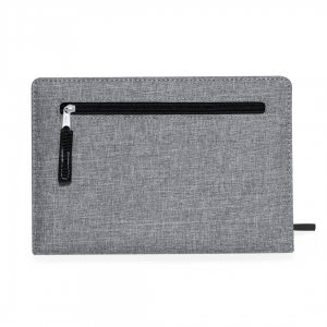 Artikel-Nr: KTO20935008000Notizbuch aus RPET 300D. Mit festen Einbänden und einer Tasche in der Rückseite mit Reißverschluss. Enthält 100 Blätter mit einzeiligem Layout, elastischem Bandverschluss und seitlichem Stifthalter. In Grau, mit eleganten schwarzen Details. RPET-Logo auf der Rückseite. RPET-Material besteht aus recyceltem Kunststoff, fördert somit die Wiederverwendung von Plastikabfällen und trägt zur Nachhaltigkeit des Planeten bei.