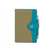 Notizbuch aus recyceltem Leder und Textil. Beinhaltet Metallkugelschreiber mit blauschreibender Mine.