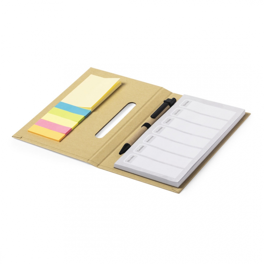 Artikel-Nr: KTO16543013000Notizblock und Kugelschreiber Set in Naturausführung, mit ewigem Wochenplaner. Hardcover aus recyceltem Karton, mit Kugelschreiberhalter und 60 Blatt für die Wochenplanung. Einschließlich 25 mittelgroße Haftnotizen und 125 Mini-Haftnotizen. Kugelschreiber mit Push-up-Mechanismus, mit Gehäuse aus Recyclingkarton -blaue Tinte.