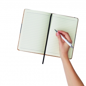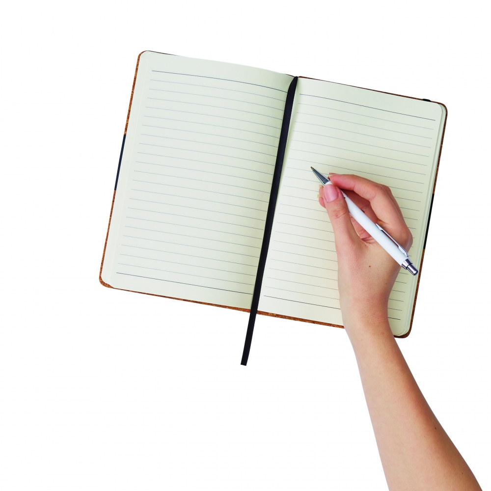 Artikel-Nr: INP56-1103305Notizbuch AMBIENCE: im DIN-A5-Format mit abgerundeten Ecken, Gummiband zum Verschließen, mit integriertem Lesezeichen, 90 Blätter, liniert, 70 g / m² - Einband aus Kork mit PU-Zierstreifen