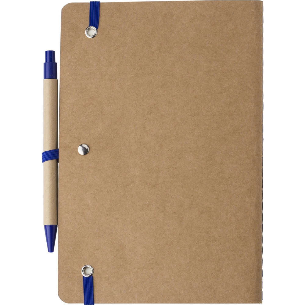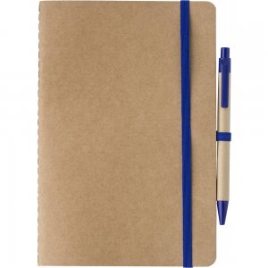 Artikel-Nr: GIV1015152023Notizbuch aus recyceltem Karton (AA5) mit 120 blanken Seiten. Mit passendem Stift aus Pappe / Weidenstroh (blaue Tinte), Gummiband und Stiftschlaufe in derselben Farbe. Einzeln verpackt im Polybeutel.