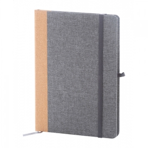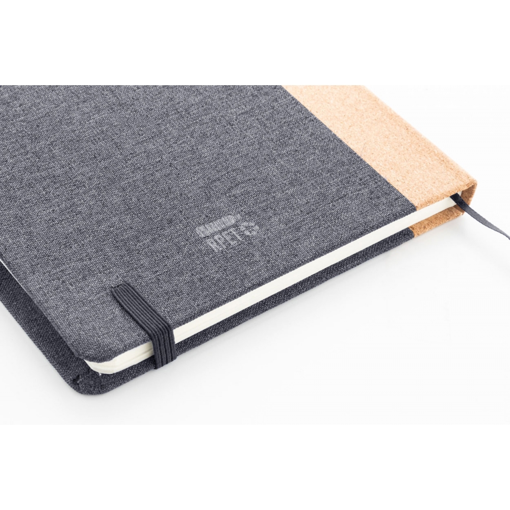 Artikel-Nr: AND808294-77A5 Notizbuch mit RPET-Polyester-Einband, Naturkorkrücken und 80 linierten Seiten aus Recyclingpapier. Mit Lesezeichen, Gummiband und Stifthalter.
