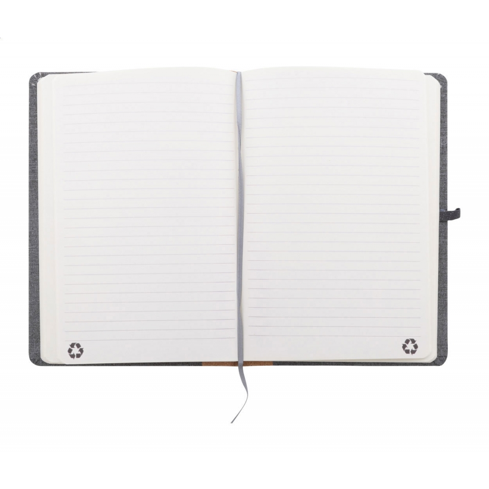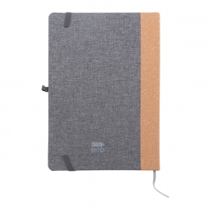 Artikel-Nr: AND808294-77A5 Notizbuch mit RPET-Polyester-Einband, Naturkorkrücken und 80 linierten Seiten aus Recyclingpapier. Mit Lesezeichen, Gummiband und Stifthalter.