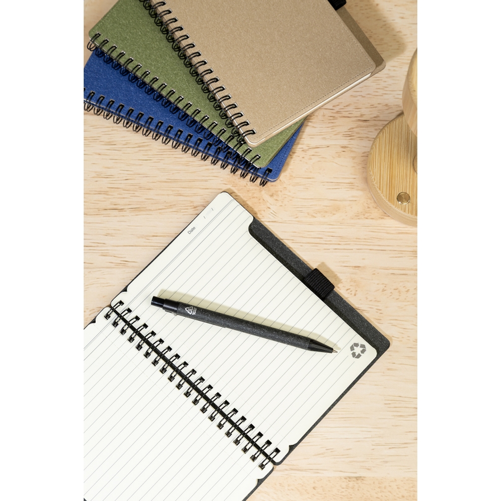 Artikel-Nr: AND800699-10Spiralnotizbuch aus Recyclingpapier mit 80 Blättern (liniert). Format A6. Inklusive Recyclingpapier und Kugelschreiber aus Recycling-PP, blauschreibend.