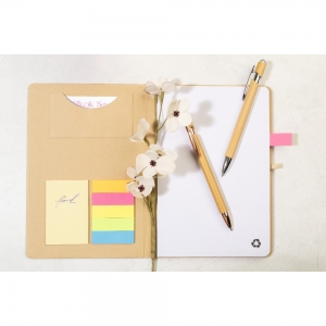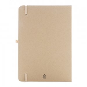 Artikel-Nr: AND800097-00Notizbuch mit Umschlag aus recycelter Pappe und 70 Blankoseiten aus Recyclingpapier. Die Innenseite des Umschlags enthält 25 Haftnotizen, 125 Seitenmarker und ein Kartenfach. Mit Gummibandverschluss und Stifthalter. Format: A5.