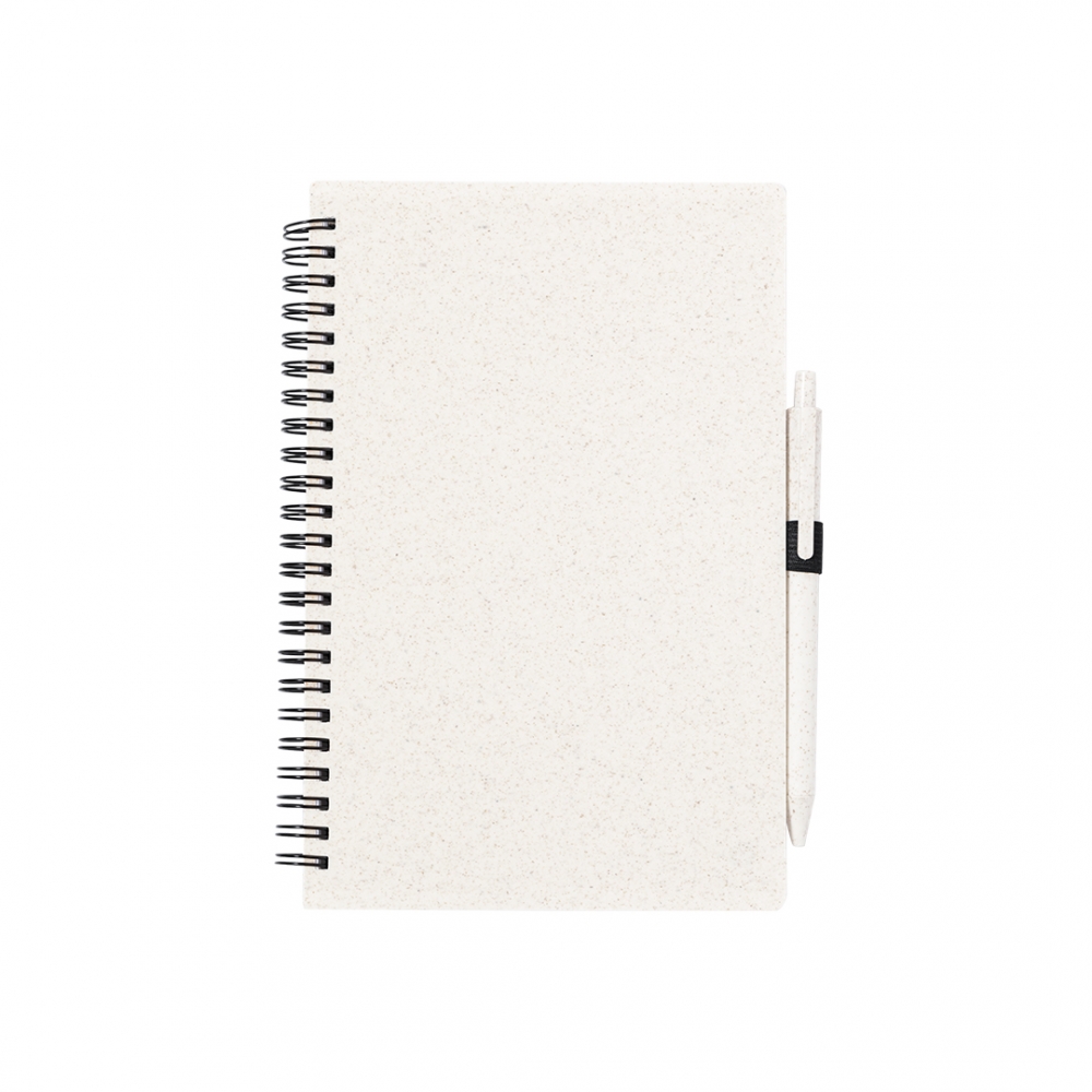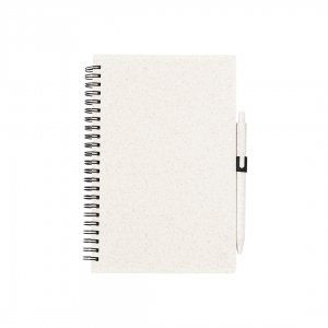 Artikel-Nr: KTO20223013000Set aus Notizbuch und Stift. Ringnotizbuch mit Weizenrohrdeckel und Stifthalter. Mit 80 Blättern im Öko-Design und einstreifigem Layout. Kugelschreiber mit Druckknopfmechanik, Weizenrohrschaft und blauer Tinte. Mit Weizenstroh-Logo. Präsentiert in einer individuellen, recycelten Tasche. Hergestellt aus pflanzlichen Elementen, um die Verwendung natürlicher Rohstoffe zu fördern und Schadstoffemissionen zu reduzieren.