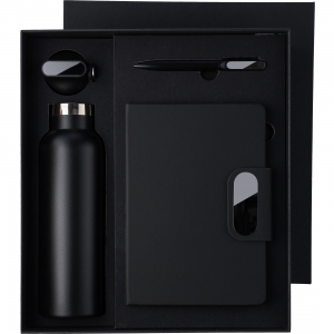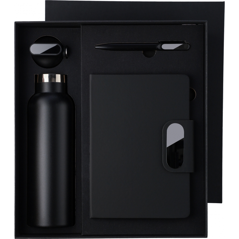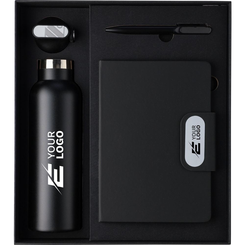 Artikel-Nr: GIV1273145001Dieses Geschenkset aus Karton besteht aus einer doppelwandigen Trinkflasche aus recyceltem Edelstahl (304) mit Silikongriff, einem Drehkugelschreiber aus recyceltem Aluminium mit blauer Tinte sowie einem Notizbuch aus recyceltem PU mit 80 Blatt 70 g / m² liniertem FSC-Papier. Das Notizbuch verfügt über ein Lesezeichen mit Band sowie einen magnetischen Metallverschluss mit Gravurplatte aus Rotguss. Alle Artikel sind mit einem recycelten Logo versehen: Es ist auf der Flasche und dem Kugelschreiber eingraviert und auf dem Notizbuch geprägt.