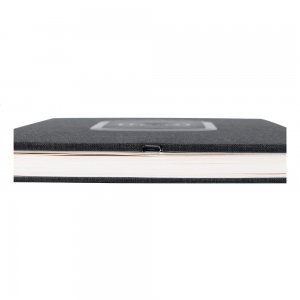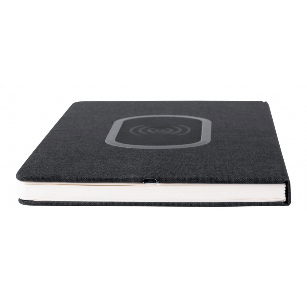 Artikel-Nr: AND721138-10A5 Notizbuch aus 300D Polyester mit eingebautem Wireless-Charger (5W) und Notizblock (80 Seiten, liniert). Inkl. USB-Ladekabel.