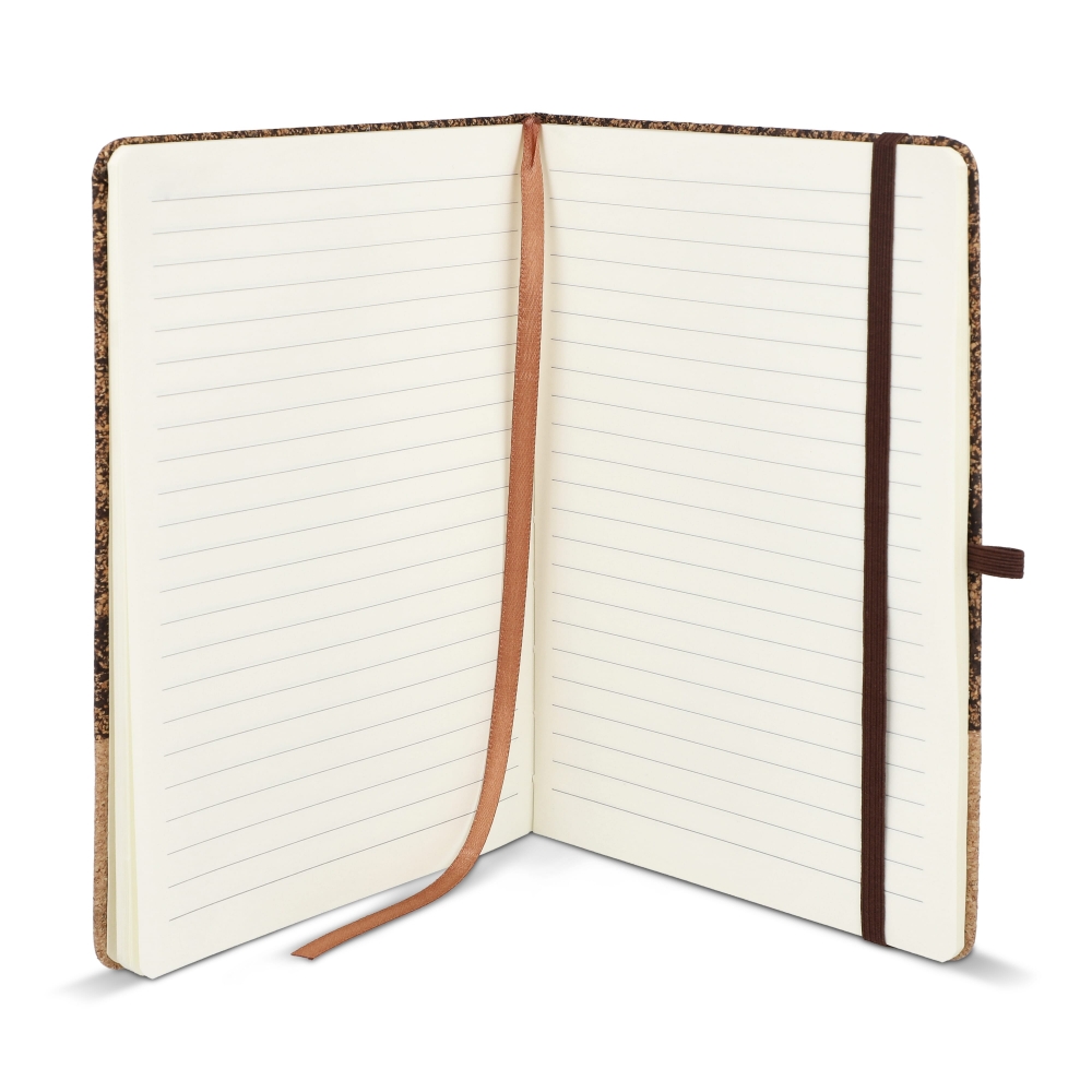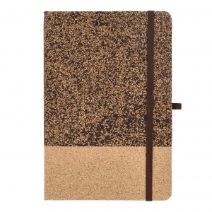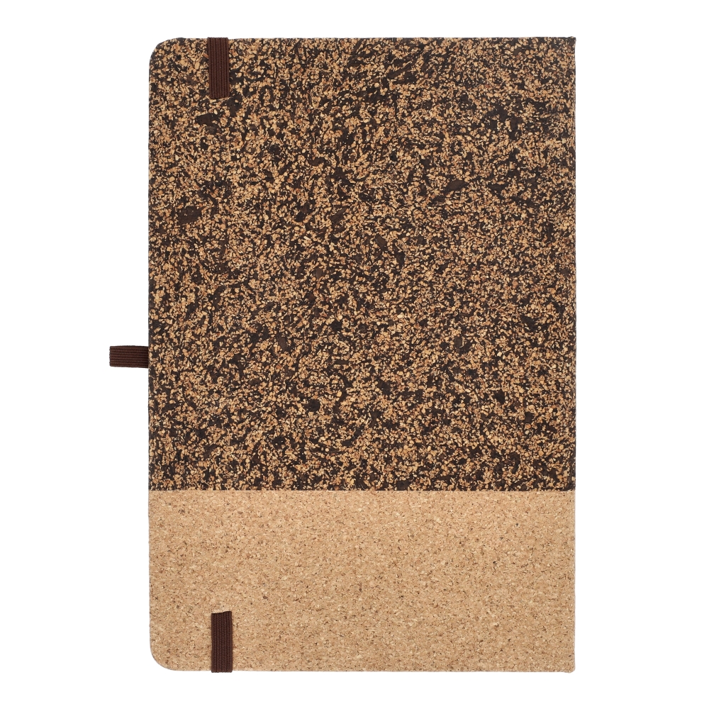 Artikel-Nr: ART92062N0094A5-Notizbuch mit einem einzigartigen Einband aus Kork und Kaffeesatz. Mit elastischem Verschluss, Stiftschlaufe und Lesebändchen. Enthält 80 linierte cremefarbene Blätter aus FSC-zertifiziertem Papier. Eine natürliche und unverwechselbare Wahl.