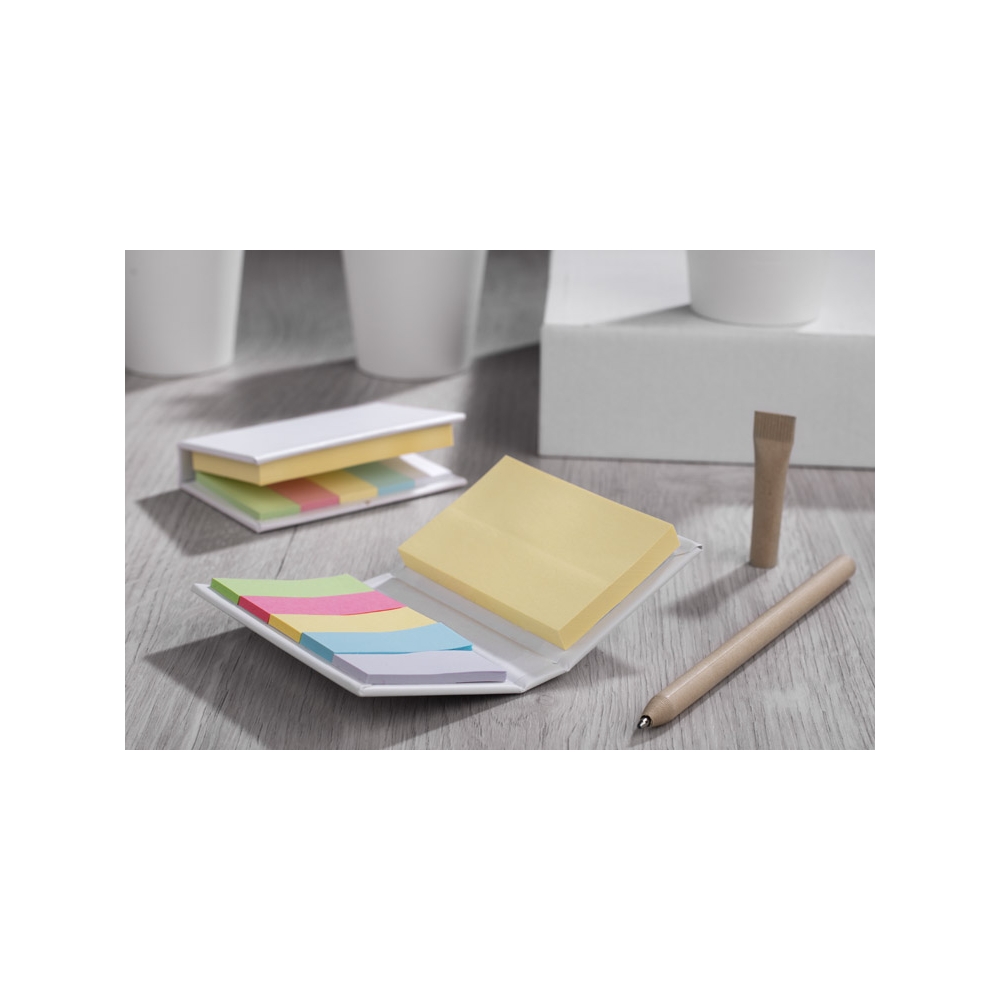 Artikel-Nr: ARD17539LECTURE ist ein kleines, handliches Notizbuch mit einem Satz Haftnotizen. Es enthält 5 Farben kleiner Notizzettel à 25 Stück pro Farbe und 70 große Notizzettel. Das Logo wird auf das Notizbuch gedruckt. Die Anordnung der einzelnen Farben der Haftnotizen innerhalb einer Charge kann variieren.