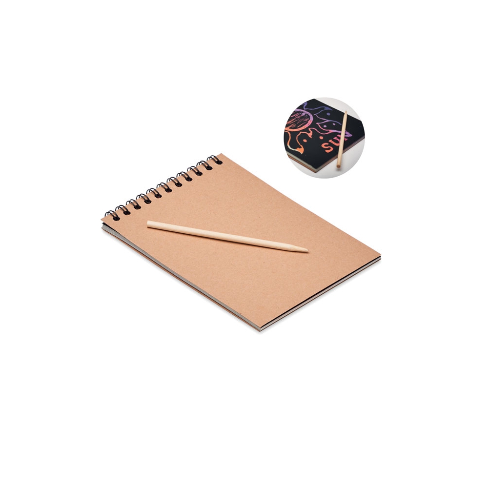 Artikel-Nr: OCBMO6699-40Kraftpapier-Notizbuch mit Spiralbindung. 10 schwarze Rubbelblätter aus Recyclingpapier und Stift aus Holz. Unter der Oberfläche befindet sich Papier in Regenbogenfarben.