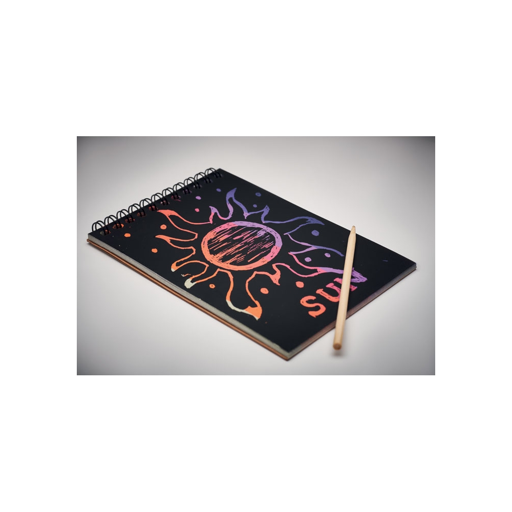 Artikel-Nr: OCBMO6699-40Kraftpapier-Notizbuch mit Spiralbindung. 10 schwarze Rubbelblätter aus Recyclingpapier und Stift aus Holz. Unter der Oberfläche befindet sich Papier in Regenbogenfarben.