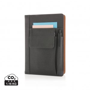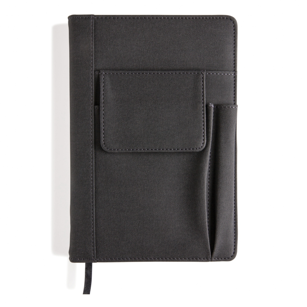 Artikel-Nr: XND773071Beschichtetes PU Notizbuch mit Telefontasche (14 x 10 cm), Stifthalter und Hauptfach für z. B. eine Powerbank oder Visitenkarten. Schwarzer Seitenteiler und 160 linierten Seiten aus 80g / m2. Mit neuem A5 Notizbuch kann das Cover stets wiederverwendet werden.