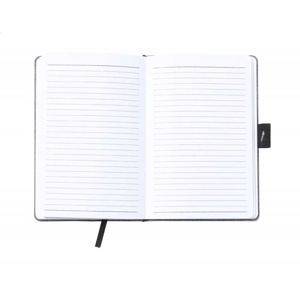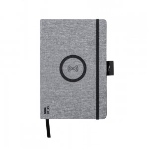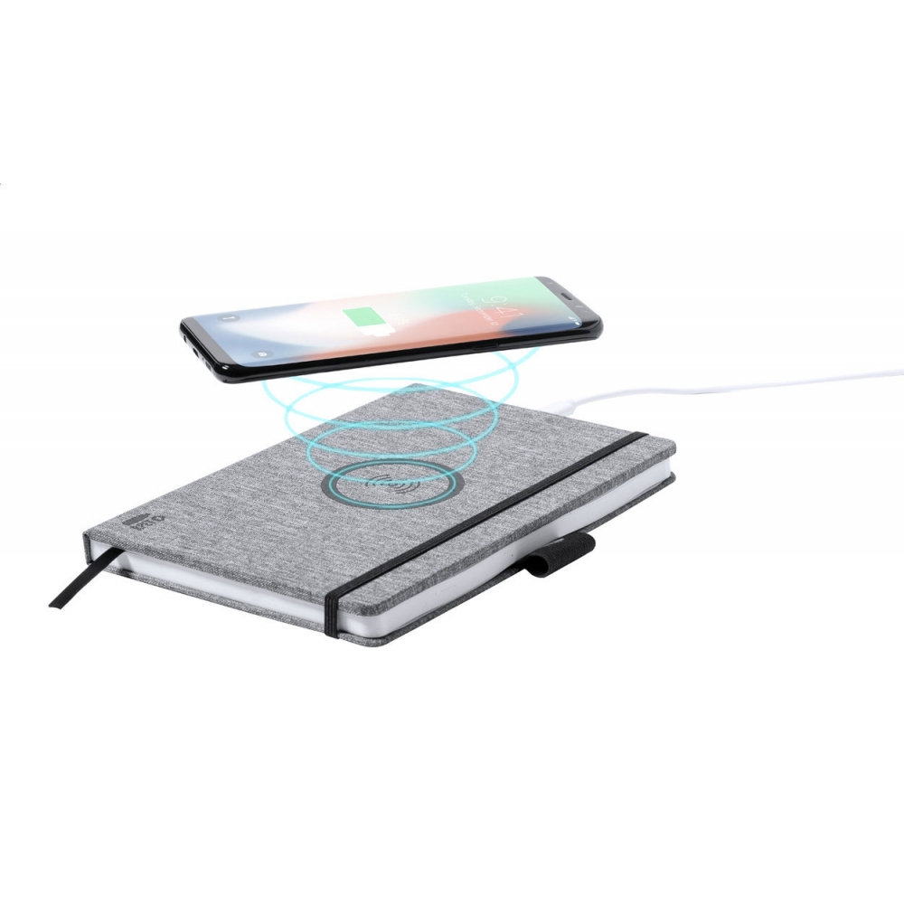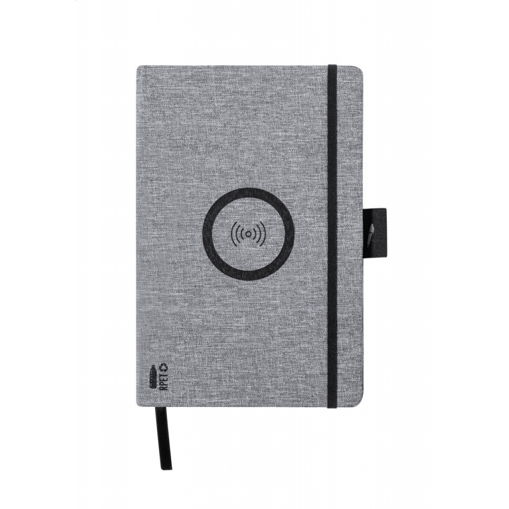 Artikel-Nr: AND722169-77A5 Notizbuch mit Einband aus 300D RPET-Polyester, eingebautem Wireless-Fast-Charger (10W) und 80 linierten Inhaltsseiten. Inkl. USB-Ladekabel.