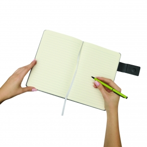 Artikel-Nr: INP56-1103347Notizbuch NEWSFLASH, im DIN-A5-Format: mit abgerundeten Ecken, Magnet zum Verschließen, mit integriertem Lesezeichen, Einband aus recyceltem Polyester (RPET), 80 Blätter, liniert, 70/m²