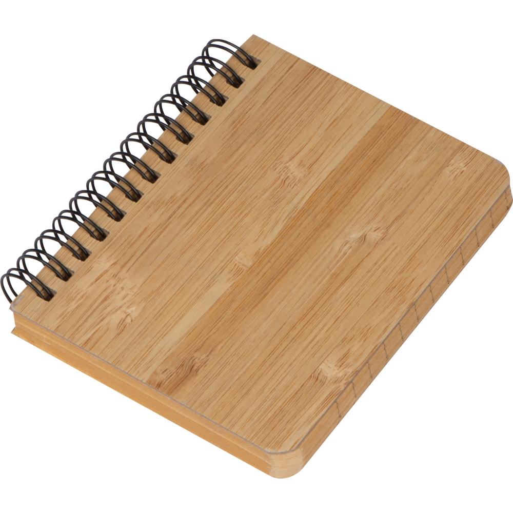 Artikel-Nr: EAG274013Kleines Notizbuch mit Spirallbindung, Bambuscover und 160 linierten Seiten aus recyceltem Papier. Ihre Werbung gravieren wir vorne auf das Cover.