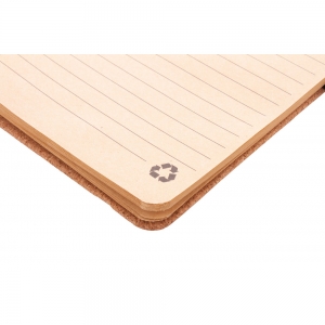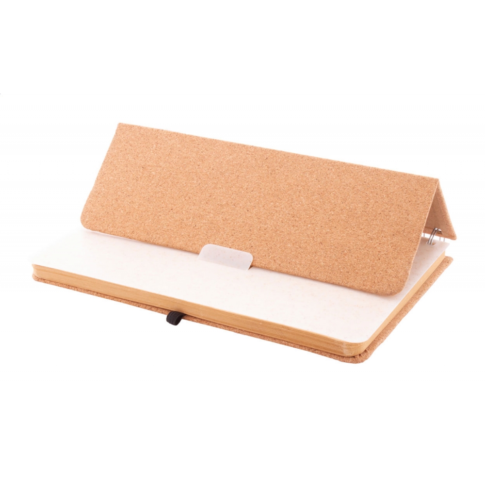Artikel-Nr: AND800516A5 Spiral-Notizbuch mit Umschlag aus natürlichem Kork, Handy- und Tablethaltereinsatz aus Weizenstrohkunststoff, 70 linierten Seiten aus recycletem Kraftpapier, Gummiband und Stifteschlaufe.