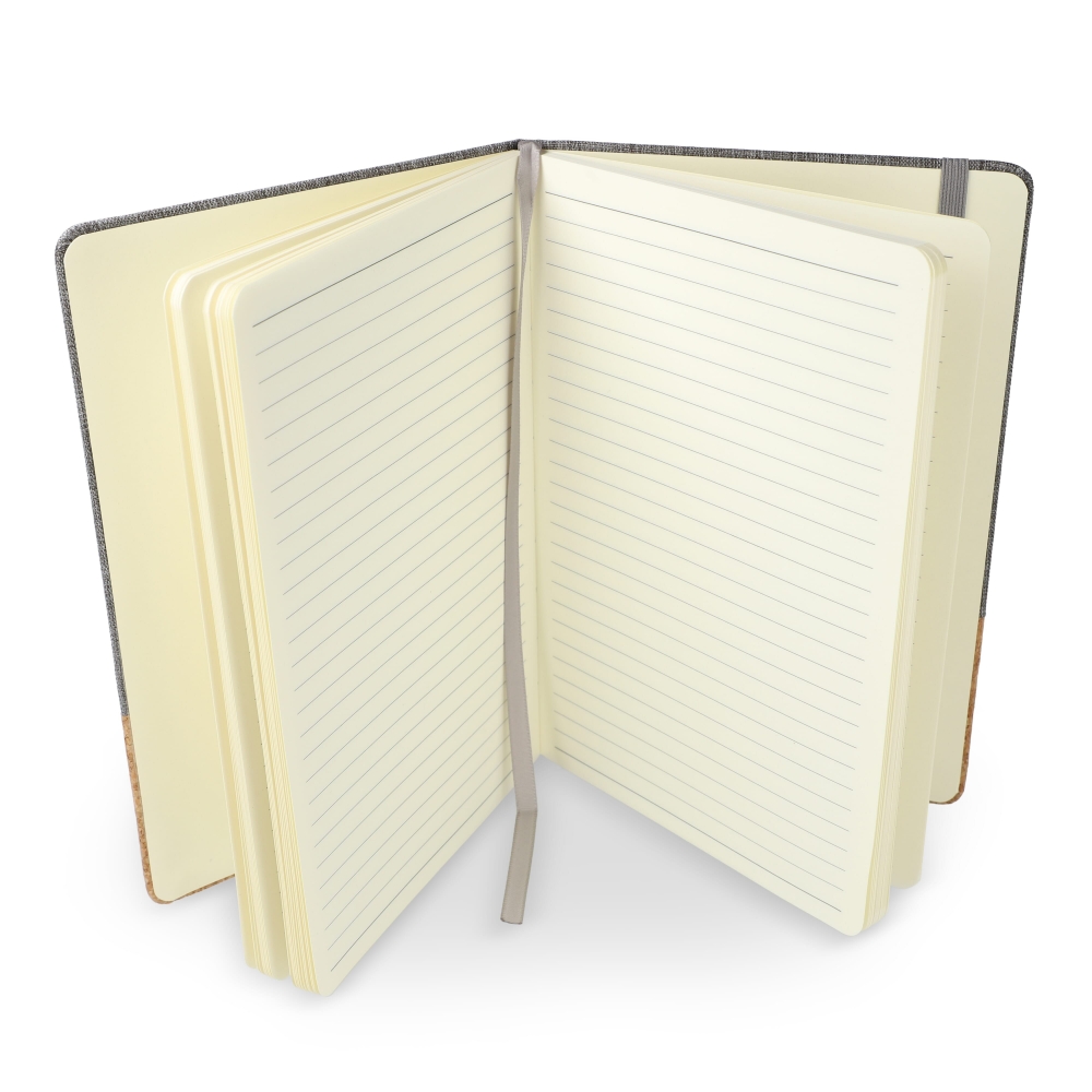 Artikel-Nr: ART92085N0061Dieses Notizbuch hat einen Einband aus recyceltem PET und Kork mit 80 linierten 70-Gramm-Blättern aus FSC-zertifiziertem Papier. Es verfügt über einen Gummibandverschluss und ein Lesezeichen-Band für zusätzlichen Komfort. Hergestellt aus R-PET