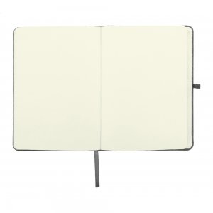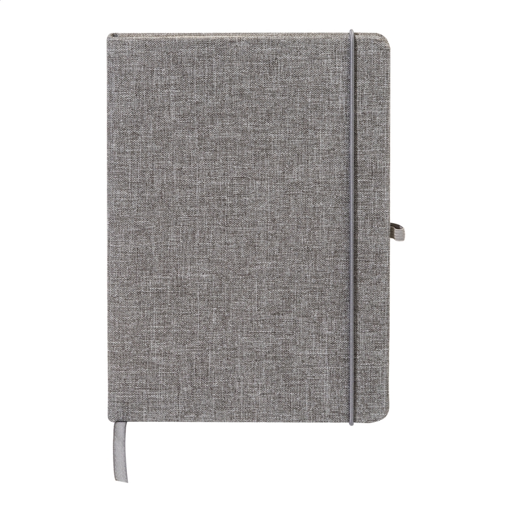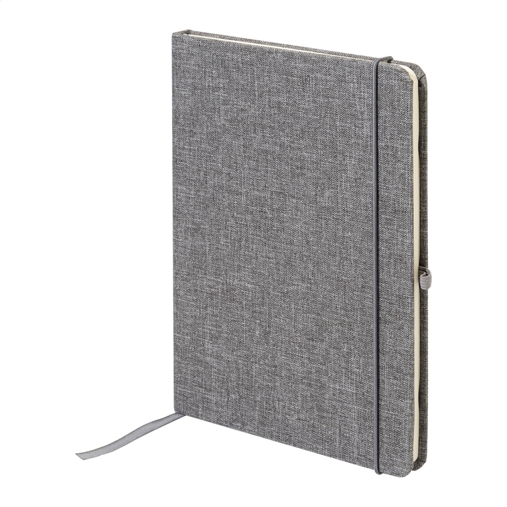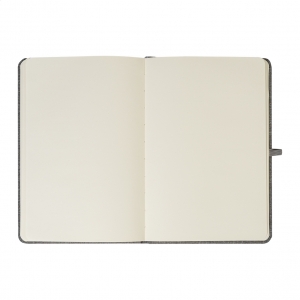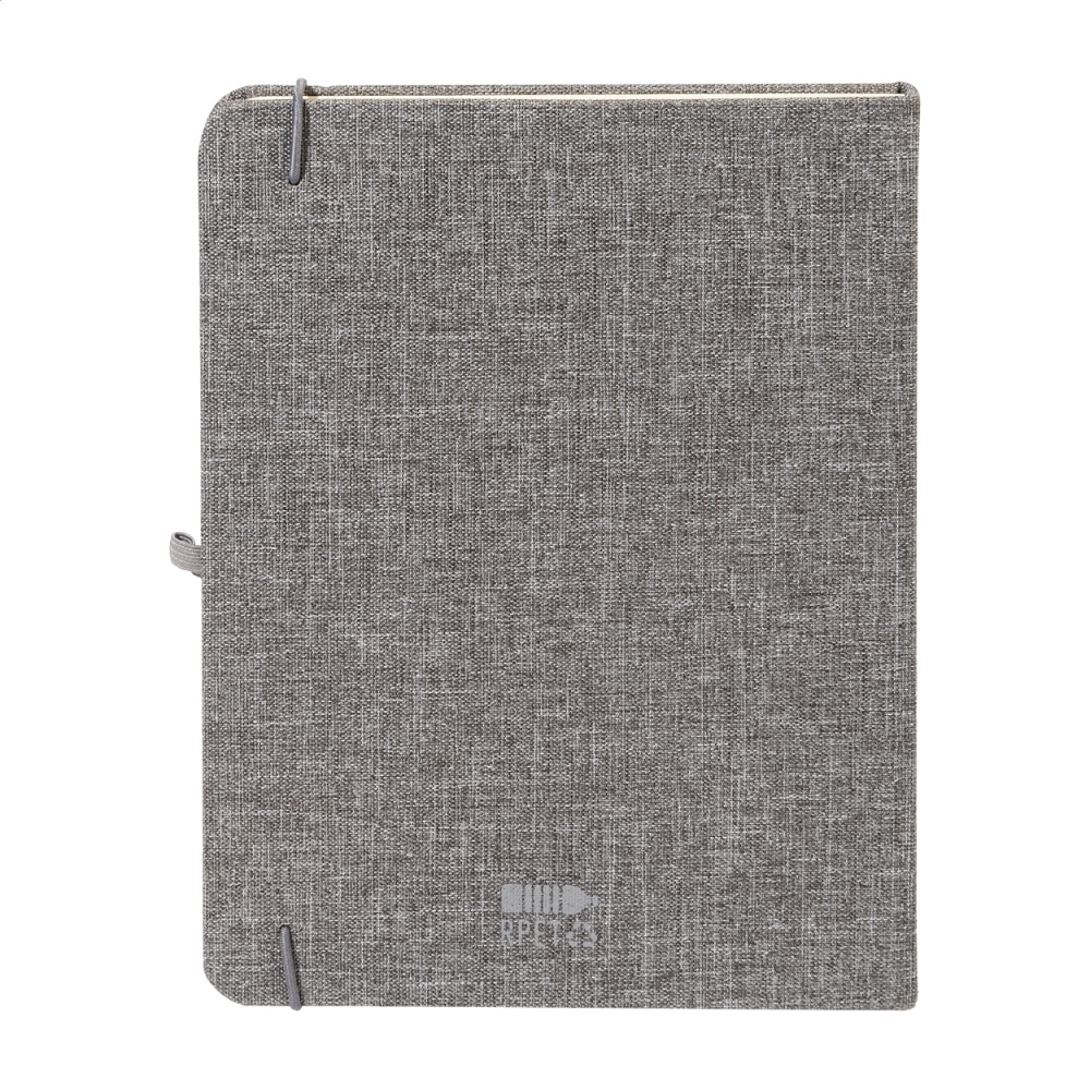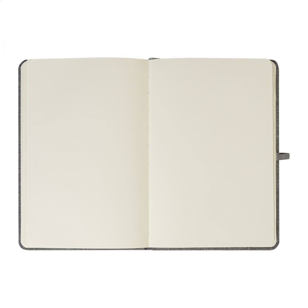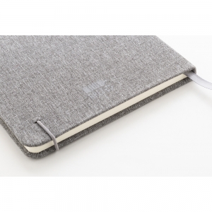 Artikel-Nr: AND800079-77A5 Notizbuch mit Cover aus 300D RPET Polyester mit 80 blanko Seiten und farblich abgestimten Gummiband, Lesezeichen sowie Stifteschlaufe.