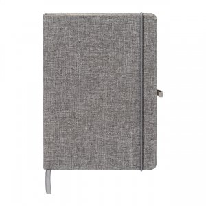 Artikel-Nr: AND800079-77A5 Notizbuch mit Cover aus 300D RPET Polyester mit 80 blanko Seiten und farblich abgestimten Gummiband, Lesezeichen sowie Stifteschlaufe.