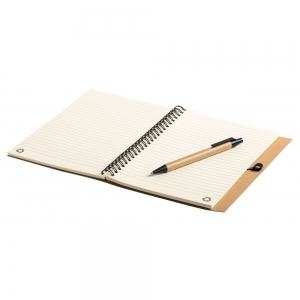 Artikel-Nr: AND721490Spiral-Notizbuch aus recyceltem Karton. Inkl. Kugelschreiber aus Recyclingpapier, blauschreibend. 80 linierte Seiten, Größe A5.