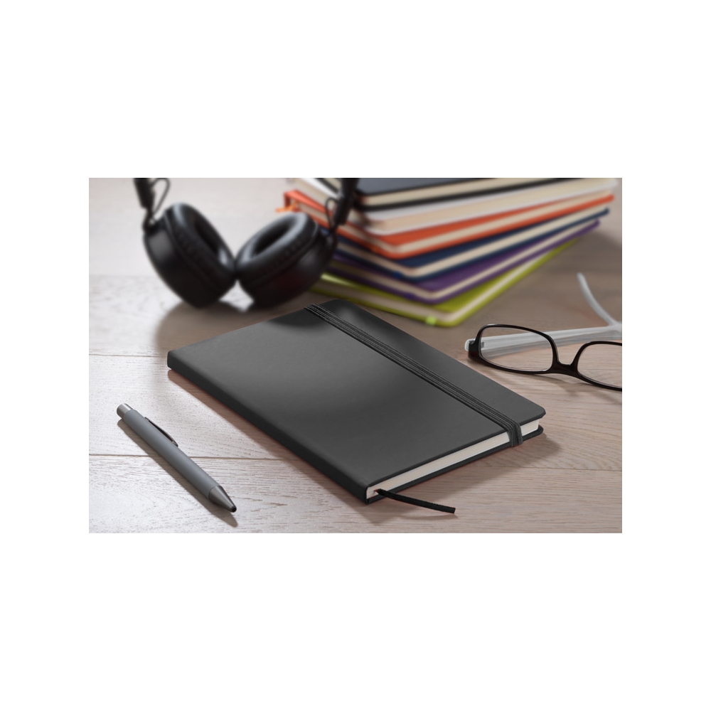 Artikel-Nr: ARD17545-02Geschmackvolles A5 Notizbuch mit farbigem Gummiband aus lederähnlichem Material (PU). Das Notizbuch enthält 80 ecrufarbene Blätter mit orangefarbenen Linien. Wir drucken Ihr Logo auf den Einband.