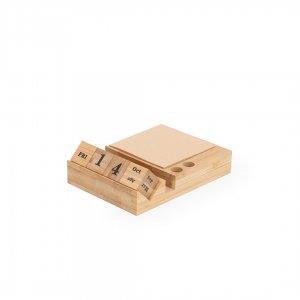 Artikel-Nr: KTO21385013000Perpetueller Kalender-Notizblockhalter aus Bambus. Dieser elegante perpetuelle Kalender verfügt über Würfel, die die Wochentage, Monate und Tage des Monats anzeigen. Er enthält einen Smartphone-Halter, 100 Haftnotizen aus Kraftpapier und Steckplätze für zwei Stifte. Perfekt, um Ihren Schreibtisch organisiert und stilvoll zu halten. Materialien wie Bambus fördern die Verwendung natürlicher Rohstoffe und reduzieren somit die Schadstoffemissionen. Es stammt von einer sehr widerstandsfähigen und vielseitigen Pflanze mit schnellem Wachstum und Regeneration, was es zu einer hervorragenden Alternative zur Verwendung von traditionellem Holz macht.