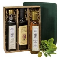 Artikel-Nr: 7980902Set bestehend aus einer Flasche Olio Extra Vergine di Oliva Viola, Schmuckflasche, 0,25 l, eine Flasche Aceto Balsamico di Modena, Schmuckflasche, 0,25 l, und eine Flasche Aceto bianco aus Weinessig und Traubenmost, Schmuckflasche, 0,25 l. In einer Schatulle mit grünem Deckel und im Umkarton bruchsicher und versandfertig verpackt.