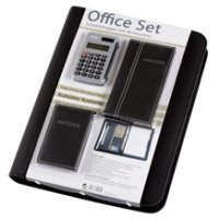 Artikel-Nr: 76930060OFFICE SET Ringbuchmappe A4, Ringmechanik, Block, Reißverschlussfach, sieben Visitenkartenfächer, Stiftschlaufe, drei Einschubfächer Inkl Büroset: Taschenrechner, Adressbuch, Notizblocketui