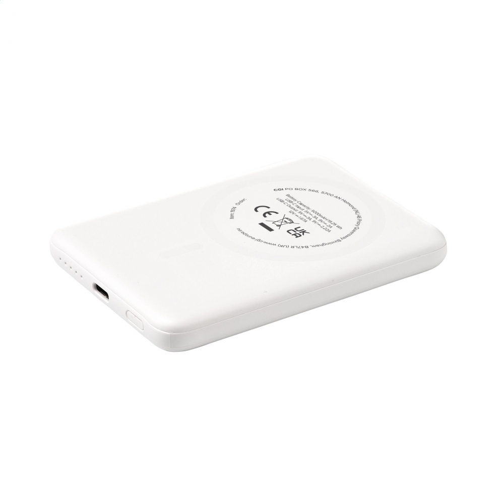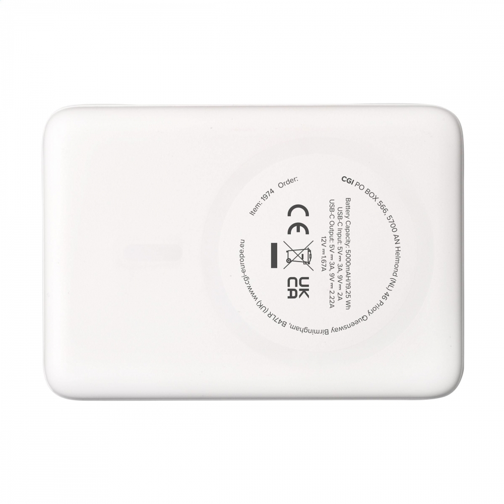 Artikel-Nr: CLP261974-002Magnetische, kabellose 15-W-Powerbank. Das Gehäuse besteht zu 100% aus GRS-zertifiziertem recyceltem Post-Consumer-ABS. Mit eingebautem Polymer-Li-Ionen-Akku (5000 mAh). Befestigen Sie das Ladegerät an der Rückseite Ihres Mobiltelefons, um Ihr Gerät aufzuladen. Kompatibel mit allen mobilen Geräten, die das kabellose Aufladen per QI unterstützen. Leistung: 15W. Bei anderen Handys kann es als normales Ladegerät verwendet werden. USB-C Eingang: 5V⎓3A, 9V⎓2.22A. USB-C Ausgang: 5V⎓3.0A 9V⎓ 2.22A 12V⎓1.67A. Inklusive USB-C/USB-C-Ladekabel aus recyceltem TPE und Gebrauchsanweisung. GRS-zertifiziert. Gesamtes recyceltes Material: 21%.